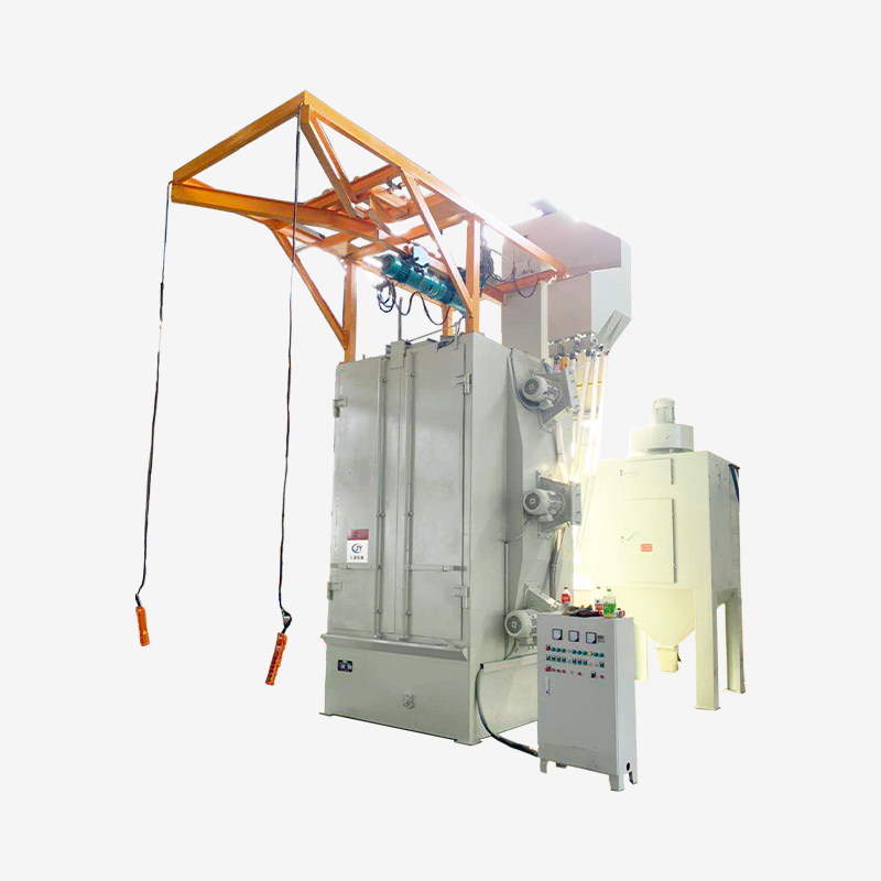 本机抛丸室为箱式。工件吊挂在电动葫芦的吊钩上,由机器顶部自动驶入室内并自转,然后气缸自动关闭大门。抛丸器把弹丸高速抛射到工件上,对其表面的粘结物进行强力打击和刮削,以达到清理的作用,抛丸清理完成抛丸室门自动打开,吊钩回到原点。